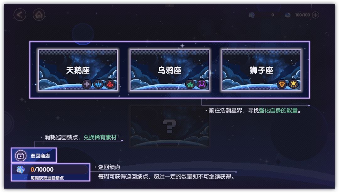 前往浩瀚星界,寻找强化自身方法吧!消耗「巡回绩点」,可以在「巡回商店」内兑换稀有素材!
