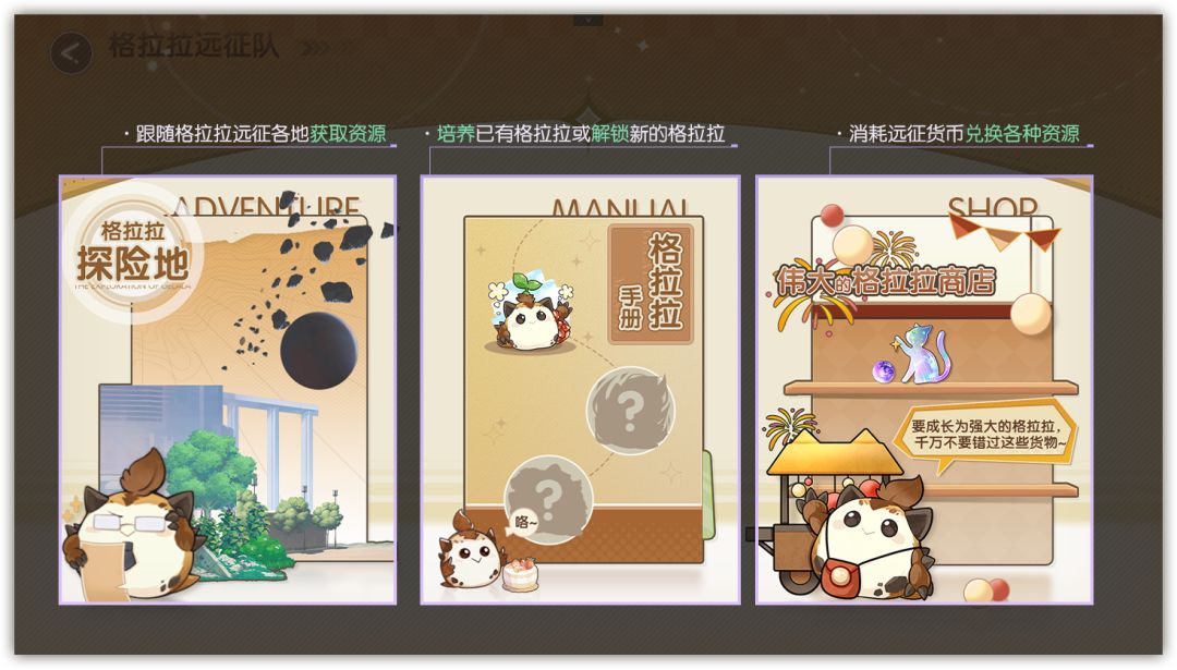 满足指定条件后,将可以委托更多种类的格拉拉加入远征队~每种格拉拉各怀本领,快来收集养成格拉拉,组建最强的远征队吧!