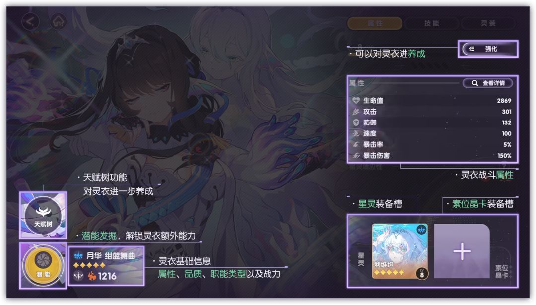 通过消耗素材,可以强化灵衣的战斗属性。通过「天赋树」与「潜能发掘」,还可对灵衣进行进一步养成。
