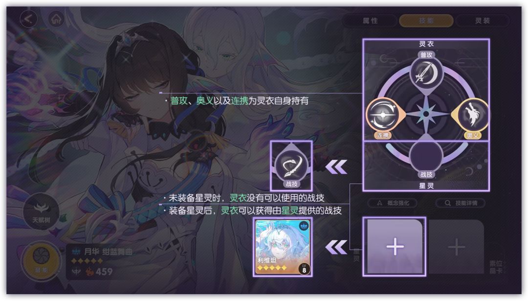 灵衣的「战技」则由装备中的「星灵」提供。可以装备的星灵不仅限于灵衣CG上的星灵,也可自由装备其他的星灵!根据来袭的强敌,自由DIY需要的技能组合吧!