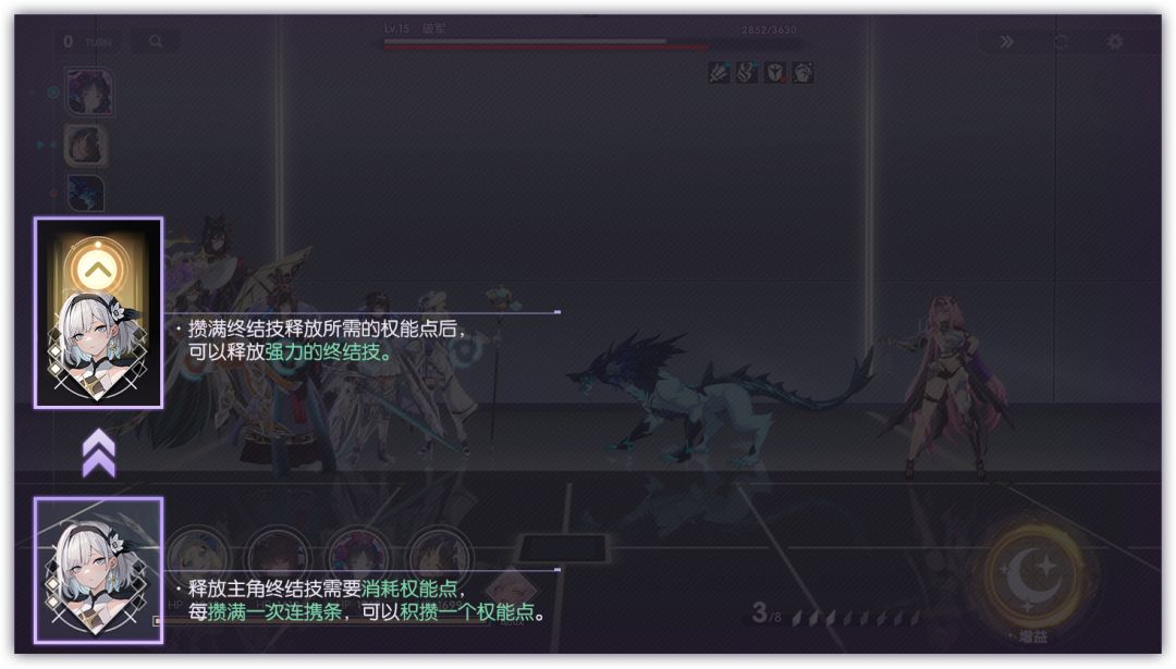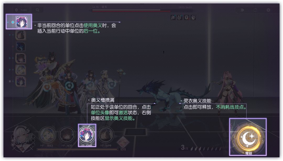 当我方角色的「奥义槽」攒满后,点击对应角色头像即可进入「奥义」预备状态!