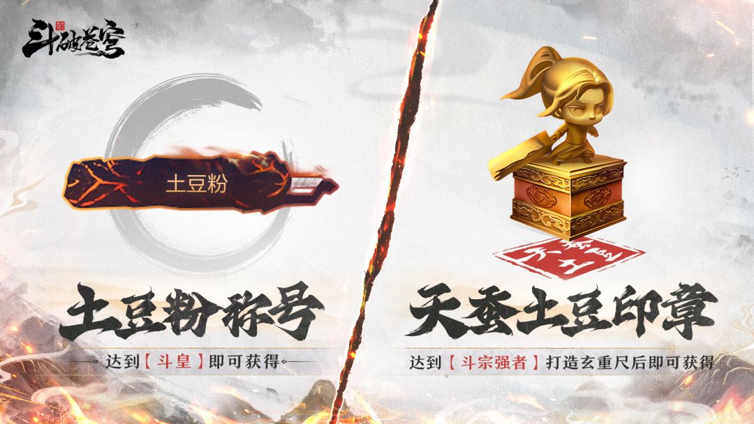 现在报名入学迦南学院,下载并体验《斗破苍穹:巅峰对决》就有机会获得巅峰体验官-天蚕土豆先生认证的【土豆粉】称号和【斗宗强者】印章。称号:游戏内达到【斗皇】即可获取土豆粉称号印章:游戏内达到【斗宗强者】锻造玄重尺后即可获取*最新获取方式请以游戏内说明为准