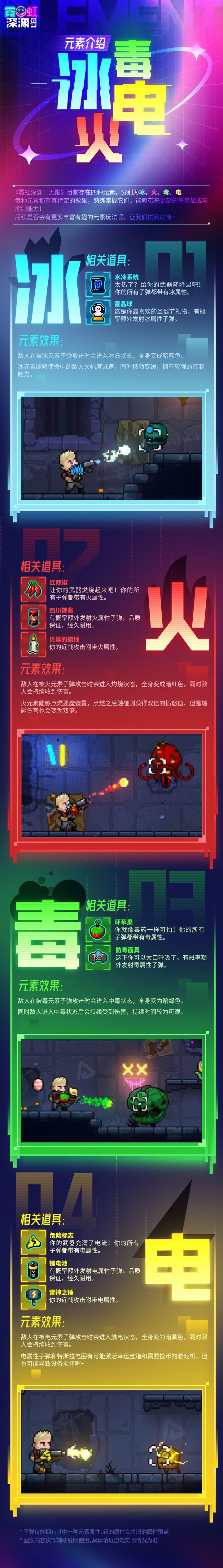 《霓虹深渊:无限》目前存在四种元素,分别为冰、火、毒、电,每种元素,都有其特定的效果。
