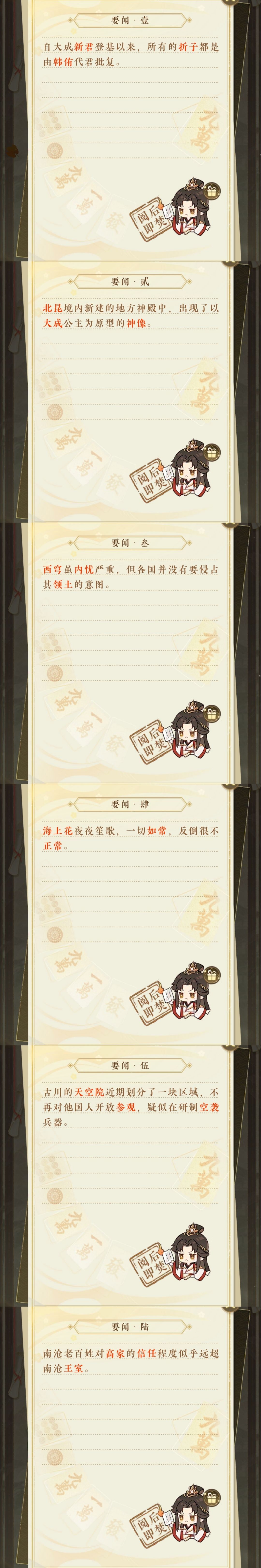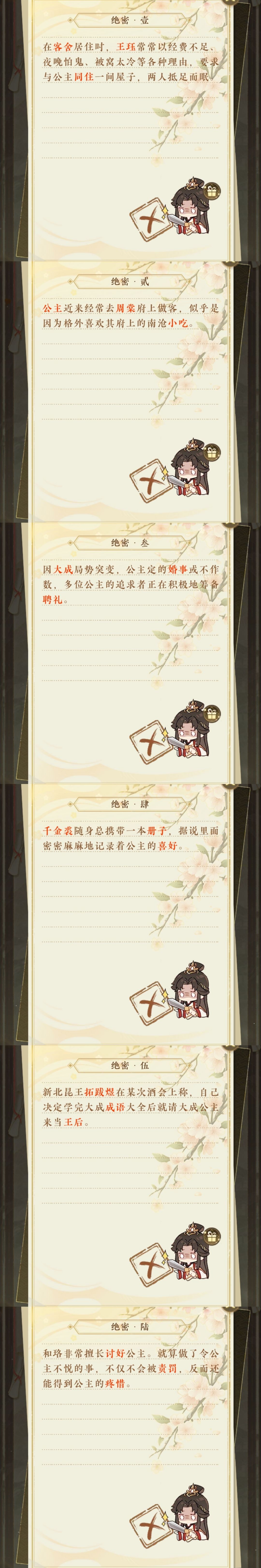公主殿下在【广罗情报】派遣小鼯鼠外出收集情报,收集到【绝密】情报并破解后即可解锁相应的【市井逸闻】。