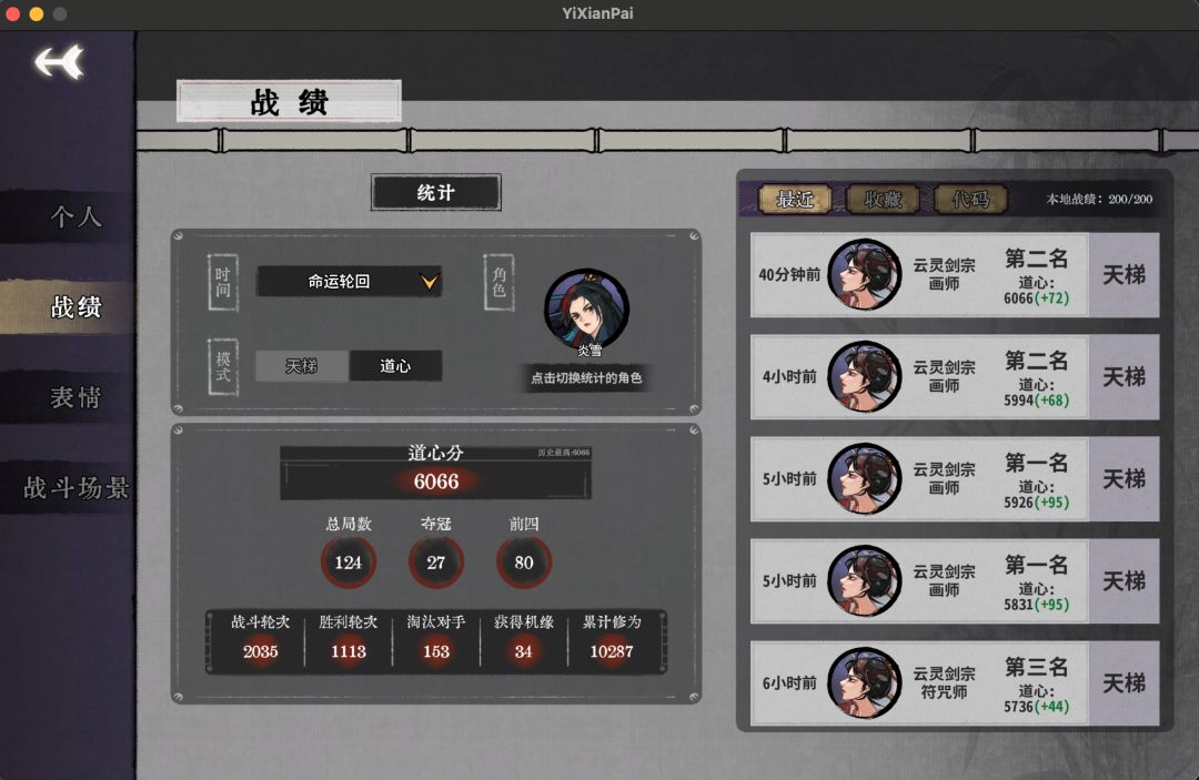 新赛季总体还是利好元婴战神的版本,炎雪大部分时间是在北伐,本人气运赛季五千分阵老头,玄心命坊赛季六千分阵/丹吾行之,熟练掌握符大师兄和琴雁子等卡组,对游戏也算是有一些粗浅的理解了,但给炎雪上分的过程也是屡屡碰壁,在5500-6000之间反复横跳,上周日和本周二两次5900渡劫局横遭天谴,狠狠掉分.第一次渡劫时我的炎雪道心也就六十局左右的样子,而这最后的几十分,是我又花了六十几局的时间烂分、速出、侥幸吃鸡来拿到的.我也偶尔觉得锻玄ABB恶心超模、吴策轮椅、策划的命元伤害设计不合理,但现在想想,其实最重要的是打牌的人而不是我们面对的牌局.