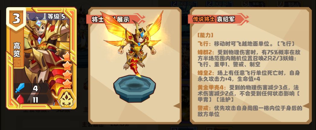 高览觉醒后获得的新技能【蜂群】,配合自身的【蜂皇】强化,可以自己形成一个成长循环。开局中路颜良,刘备,赵云,李儒四大将,能对高览造成的伤害不过4点生命值。而对应的,高览生成的4个妖蜂阵亡后,高览能获得+16/+16的加成,直接数值就碾压全场了。