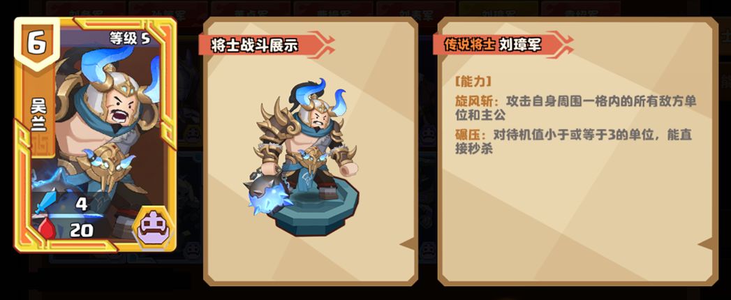 吴兰的能力【碾压】,与赵云的【无双】一样,都能秒杀待机值在一定范围内的单位。吴兰能直接秒杀待机值小于或等于3的单位,刚好能秒杀高览。还好不同于普通将士,他的攻击范围为周围一圈,只要我方高览先攻秒杀敌方吴兰,又或是使用技能秒杀吴兰即可。@纳斯寿郎圣 主公在这里保守一点,使用【审判】暴击把吴兰直接劈掉了,即使不劈掉,高览先手也能扎死吴兰就是了。