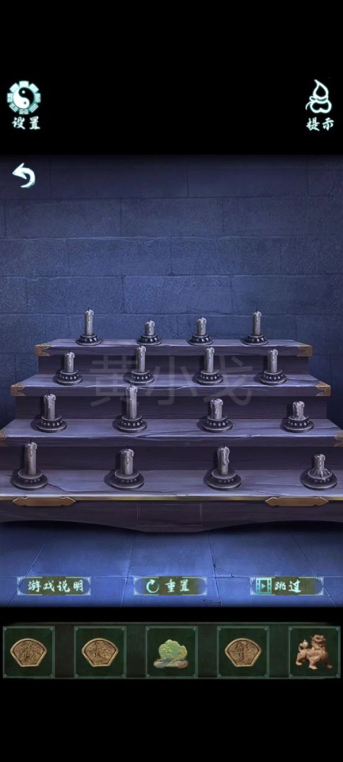 19.(画中-暗室)点击左边的蜡烛,查看游戏说明,完成点亮蜡烛小游戏;打开暗格,获得我【贵字花钱】