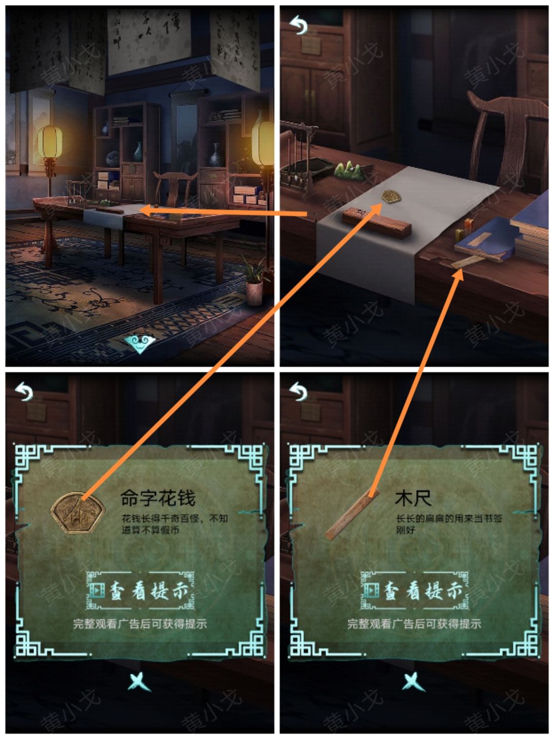 1.(画中-书房)点击书桌,获得【命字花钱】和【木尺】