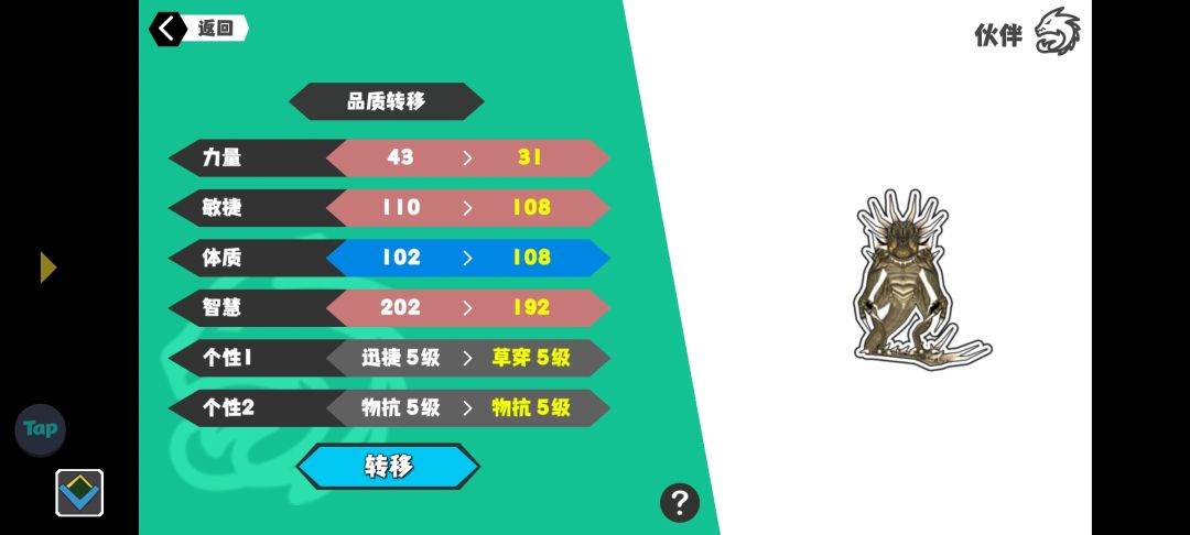 而这里就不得不提到一种特殊情况,比如你的宠物个性一很高,但他图鉴最高面板的体属性很低,那么,也许你的宠物本来是力很高的暴力宠物,但是因为他的体属性满品是45,你的有44,那么可能就会占据过多比例,导致该宠物的个性一虽然不低,但主属性 力 的绿字实际上并不高,因此总绿字也不会高,从而可能无法进化。