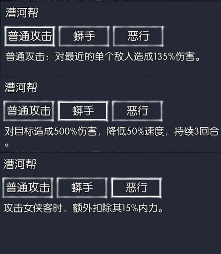 先看两种敌人的技能介绍,字太多提取关键词就是打最近还打最远,专门扣女侠客的内力,这关主要考验一个少侠对站位摆放的理解。