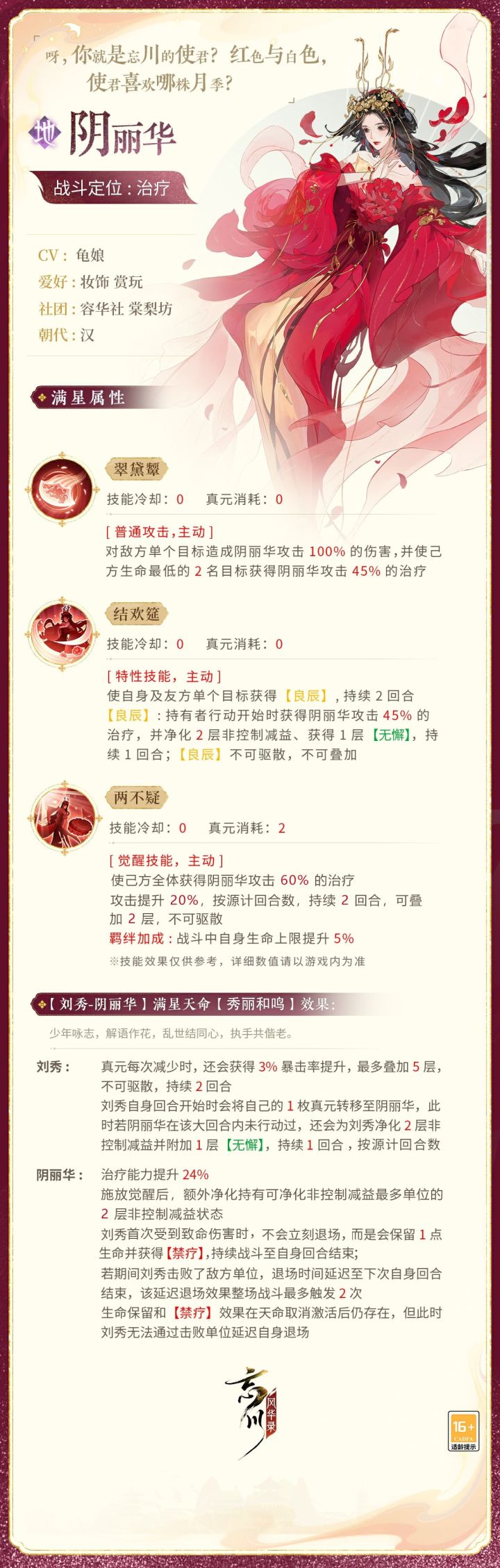 来到忘川的阴丽华将作为治疗名士出战,使君大人快戳下图了解详情吧!技能以上线实装为准~