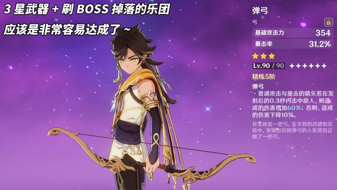 【武器】猎人之径(5星)>弹弓(3星)>其他。如有3精及以上的若水、阿莫斯之弓、最初的大魔术可替换弹弓~【圣遗物】流浪大地的乐团(80精通35%重击增伤)。主要属性,精通沙、雷伤杯、暴击头;追加属性,暴击率=暴击伤害>精通>充能>其他。