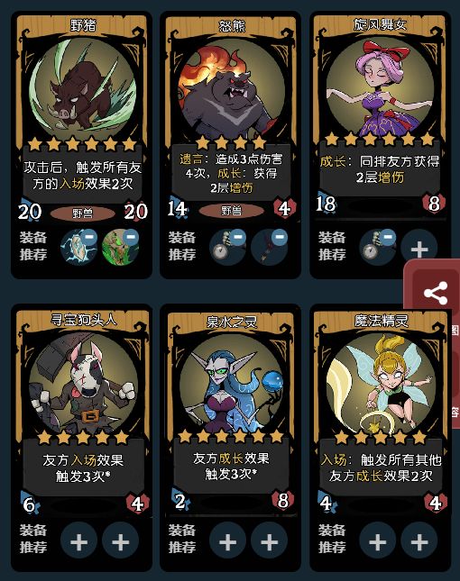 阵容搭配:金怒熊+金旋风舞女+回合后对怒熊使用金大耳火犬,怒熊装备1法力翡翠(成长:获得1层增伤)+1怀表+1战斗法杖(本随从每有1层增伤,获得+5+5),舞女装备1怀表