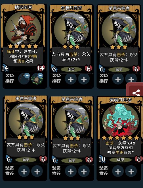 阵容搭配:金精英刺客+英雄狼王+金杀意共鸣者✖4+金灵魂共鸣者,刺客装备2噬魂镰+2鬼摇铃+2元素手镯并且拥有3张咒术效果:吞没【5】(使随从获得击杀:永久+2+2)