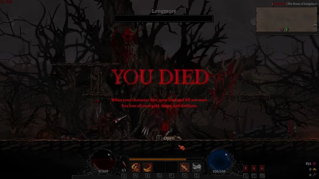 但《Dragon is Dead》最让我眼前一亮的是它处理死亡和成长的方式。这是一个 Roguelite 游戏。这意味着在你死亡之后,角色的一切都会重置:等级、物品、提供增益的神器(Artifact)和灵魂宝石(Soul Gem)、所有让你选了当前 Build 路线的因素,都会消失,只有两个例外:装备和魔石(Magic Stone)。