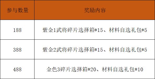 【活动奖励】紫金3武将碎片选择箱*10、材料自选礼包*20、元宝*3000