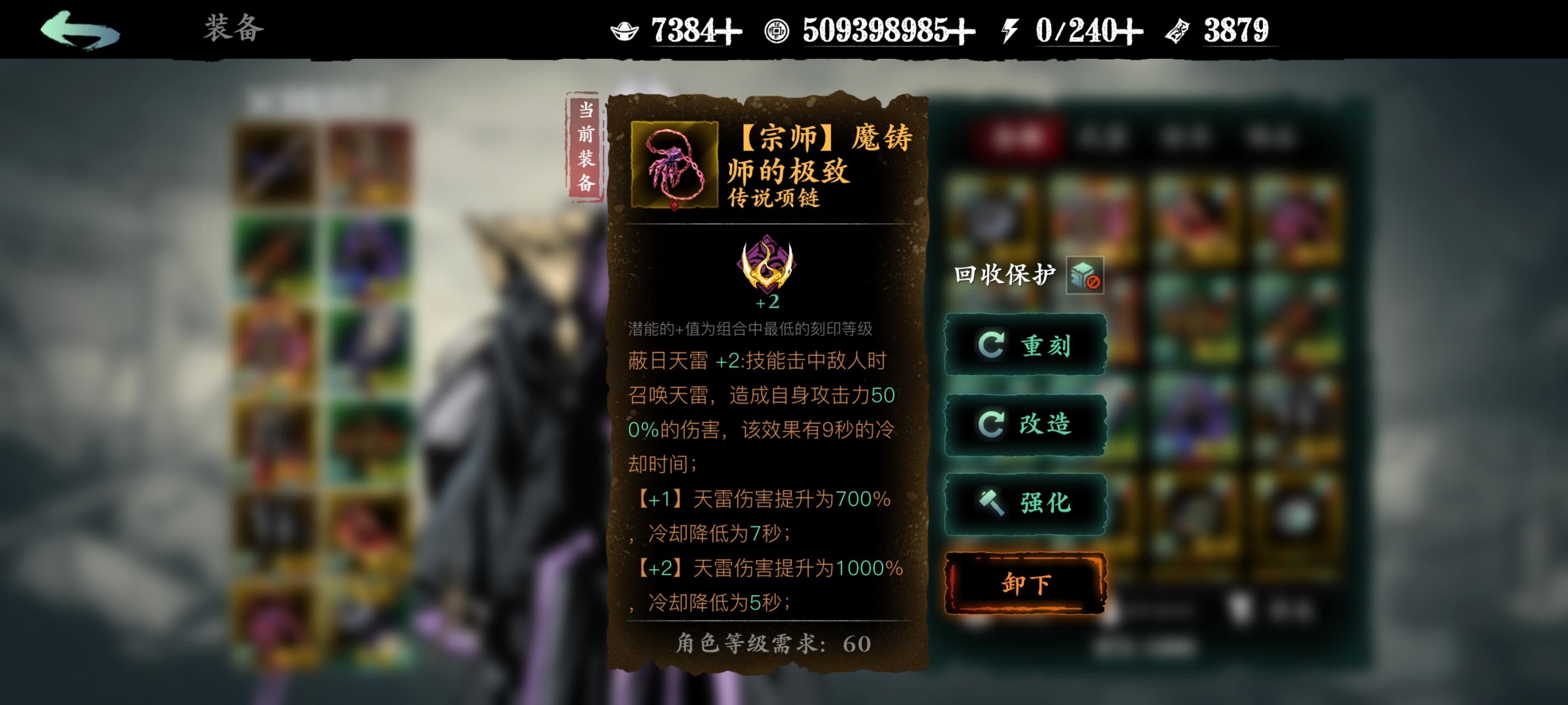 普攻伤害不要太高(普攻也能暴击嘛,诛邪再翻两倍),保证闪电能劈死就行。带诛邪和醉青鸾一般的钥匙本和卷子a一下就死,根本触发不了机皇。