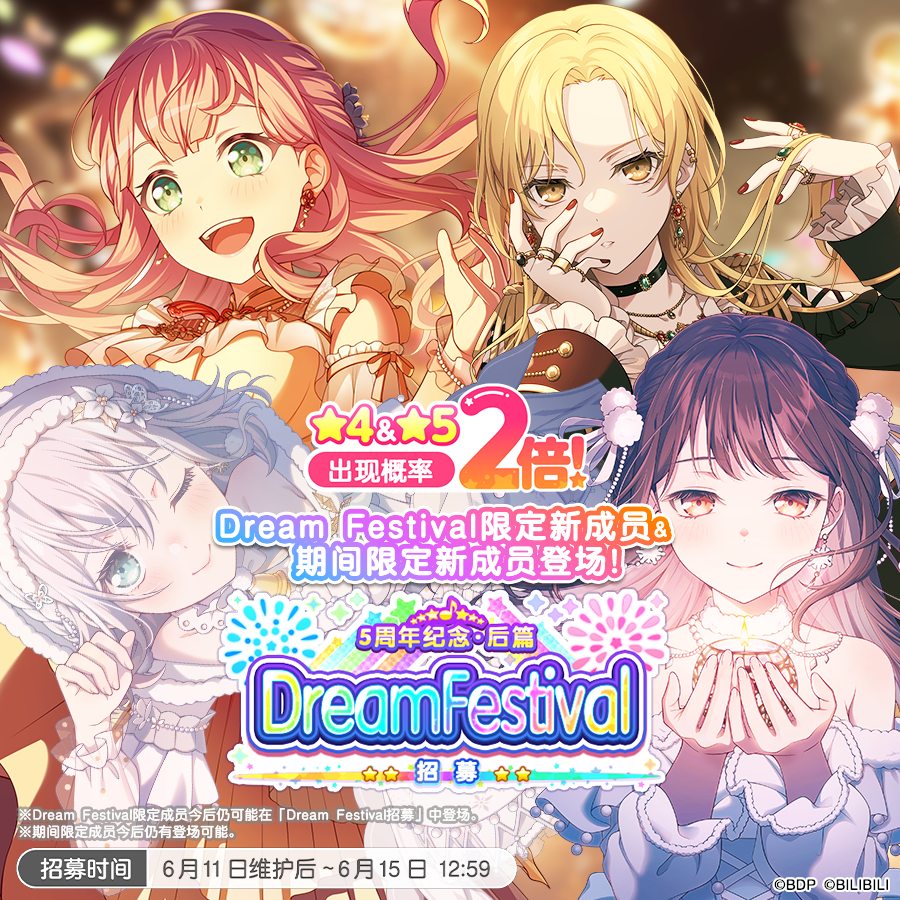 1.在「5周年庆典·后篇 Dream Festival招募」中,★5成员出现概率将提升至6%,★4成员出现概率将提升至8%!
