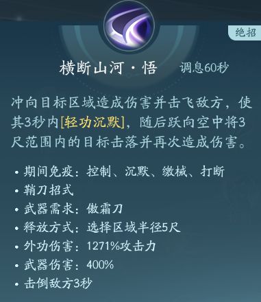 超高范围伤害,主要PVP输出技能。PVP两个秘籍都能点,pve可以点绝篇。