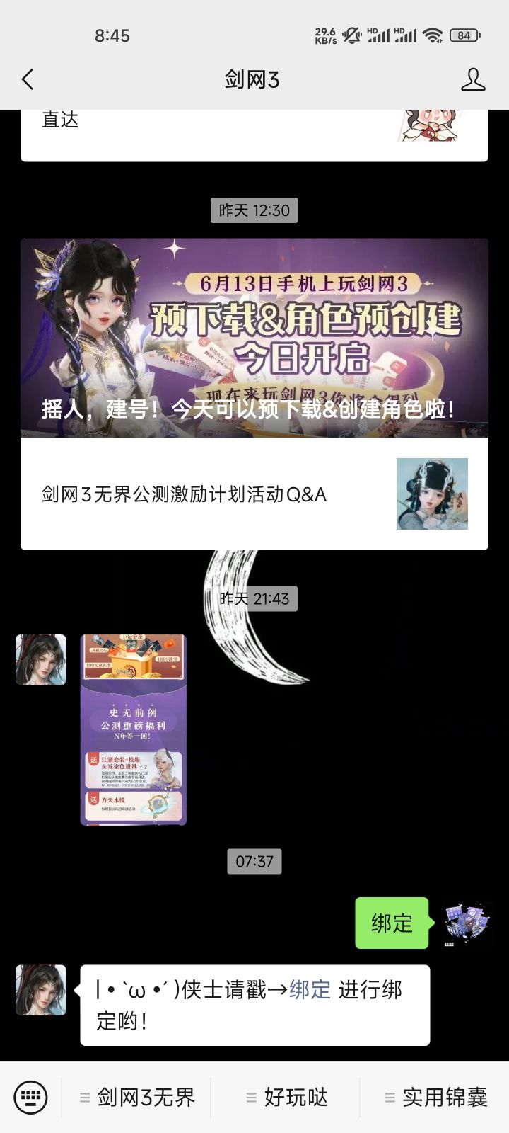 (1)完整账号名,如有此前绑定剑网3官方微信公众号进行每日签到的,可向公众号发送 绑定 查看账号名称。该账号名称即通行证账号名。