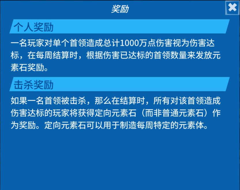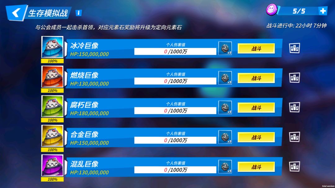 生存模拟战会在每周一的0:00自动开启,每周六的12:00结束并进入结算。生存模拟战每周会随机刷新五个不同元素的BOSS供公会玩家进行挑战,每周每个玩家最多可以获取8次挑战机会,对单个BOSS造成的伤害累计到一定数值则可以获取当前BOSS的周奖励,即“元素石”,如果在结算前公会合力击杀掉了这个BOSS,那么获取的周奖励将会升级,由“元素石”升级为“定向元素石”。