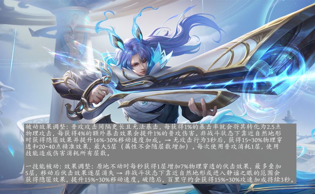 百里守约的调整是重做级,调整后的百里守约普攻可以暴击,暴击不转化为物理攻击,暴击效果不提升普攻伤害,新的被动变成了无攻击行为3秒后可以获得不叠加属性的穿透和精准BUFF,最多5层,每次普攻消耗1层,2技能消耗全部层数。