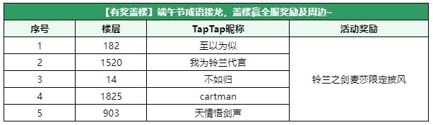 1. 感谢团长参与端午节特别话题盖楼活动,小场记会从所有评论中抽出5位送出【铃兰之剑麦莎限定披风】!