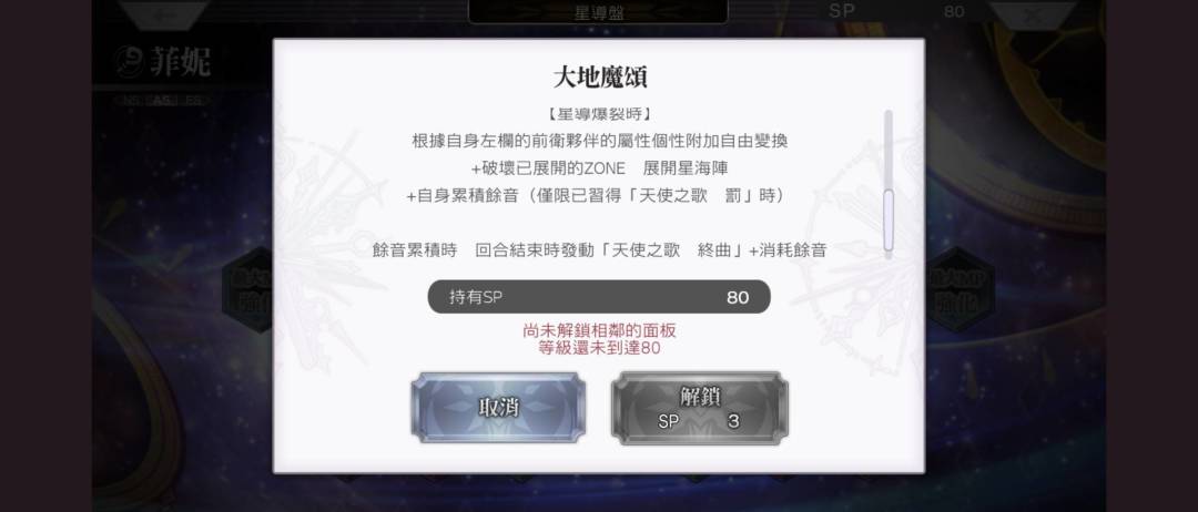 根据自身左方的前卫伙伴赋予自身属性自由变换+碎zone+展开星海zone+自身累计余音(需习得【天使之歌·罚】)