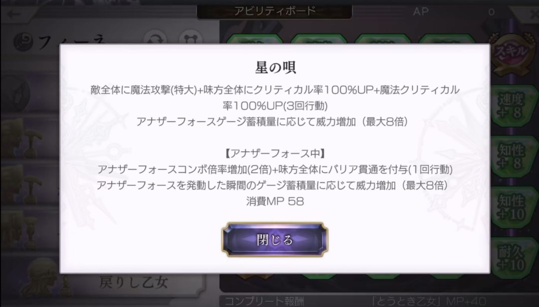 全体魔攻(特大)+物理和魔法暴击率100%up(3次行动),根据af数值的累计量(af条)增加伤害(最大8倍)