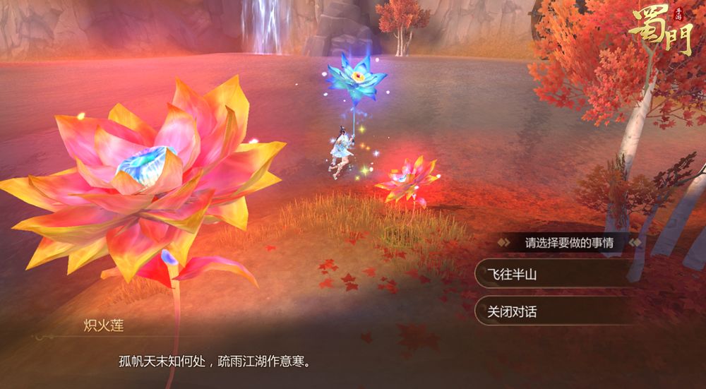 在成都西郊内有不少地方可以看到炽火莲,点击炽火莲与它对话,可以选择直接飞往指定的地点。比如自魏家村出来后不远靠近湖边的位置,就有一朵炽火莲。