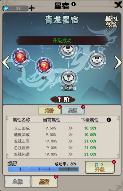 青龙星宿和白虎星宿各有20阶,消耗“星宿石”可进行升级,但升级会存在一定的成功率