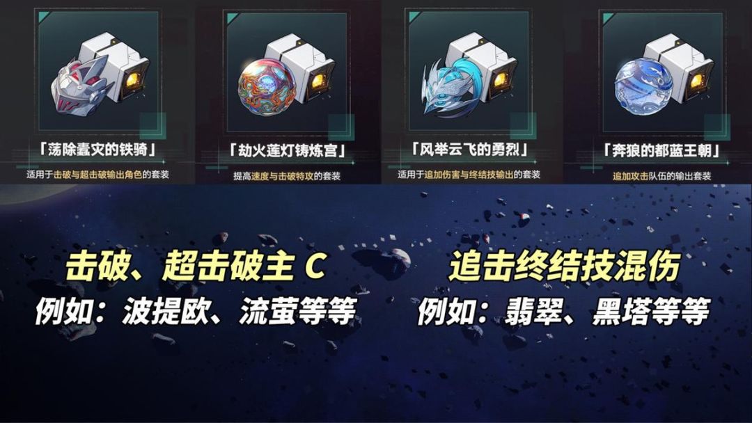 【全新遗器】①荡除蠹灾的铁骑(隧洞),适合击破与超击破;②风举云飞的勇烈(隧洞),适合追加与终结技输出;③奔狼的都蓝王朝(位面),适合追加攻击角色;④劫火莲灯铸炼宫(位面),提高速度与击破特攻。