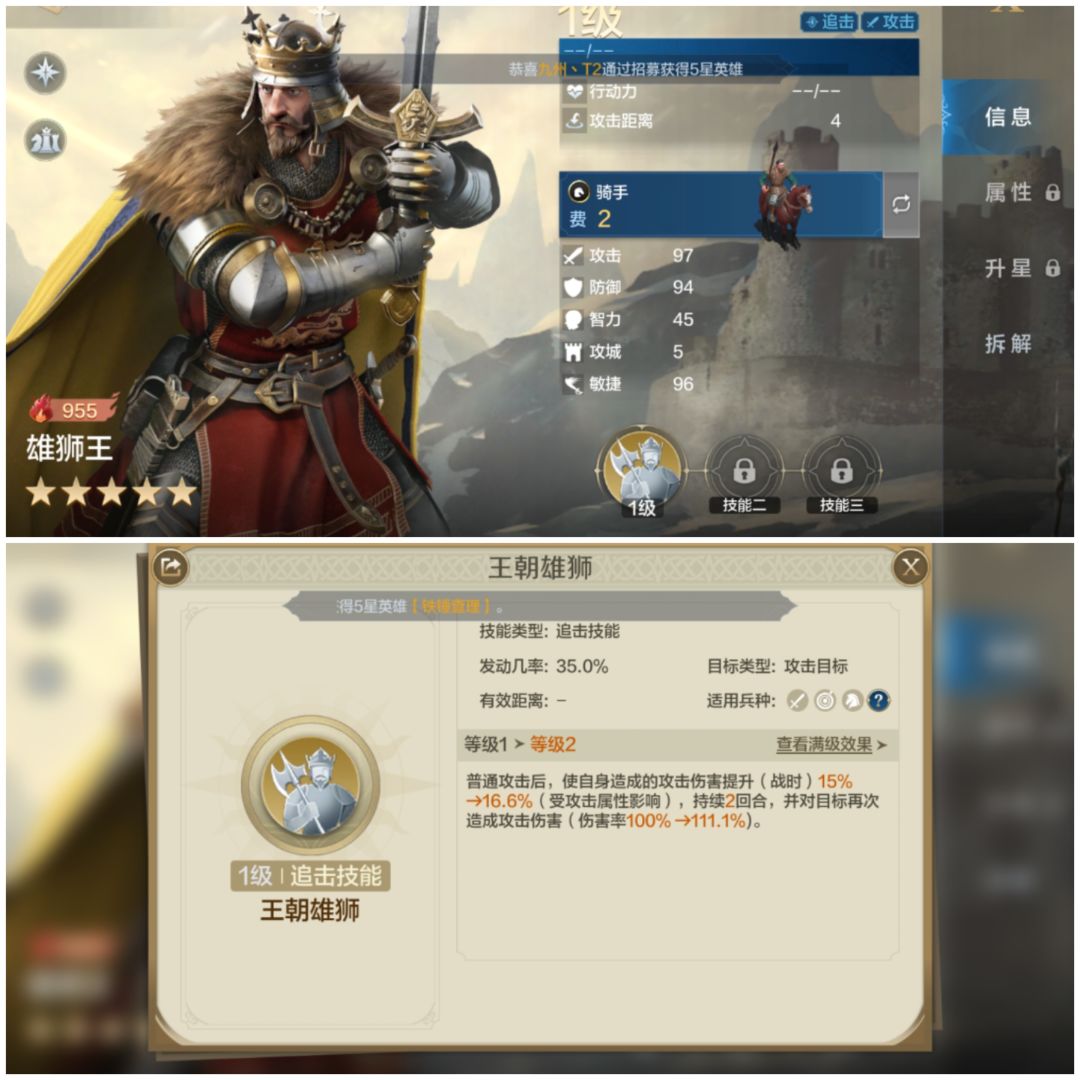 专属技能【王朝雄狮】:在普攻后,不仅能使自身的攻击伤害在接下来的2回合内得到提升,还能队目标再次造成攻击伤害。