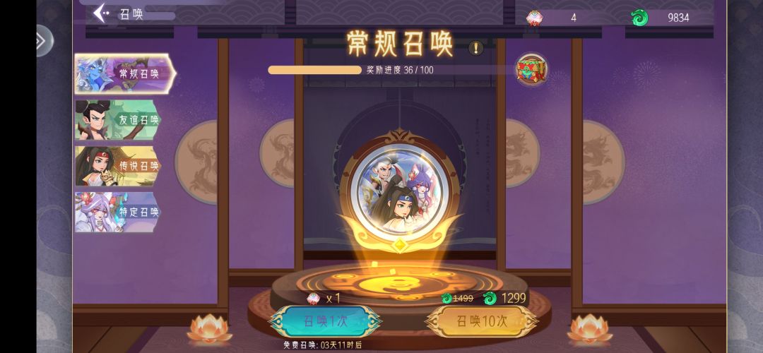 特定召唤是召唤对应阵容的每个卡都有每个卡对应的阵容,目前有天庭、灵兽、妖兽。这个抽奖也一样10连抽比出金。