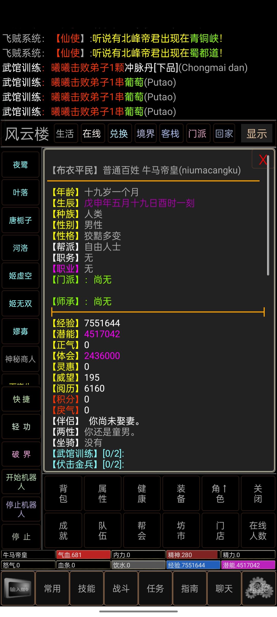 mud的世界里每个玩家都要选择性格属性,每个不同的属性,性格能学到的厉害的武功都不一样,但是每个厉害的大侠成长都要经过师门布置的考验以及游历江湖除魔卫道的历练获取经验与潜能来提升自己的等级和武功,初入江湖了然一身,须靠自身努力自立自强(进入游戏降生扬州客栈,领取降生礼包)