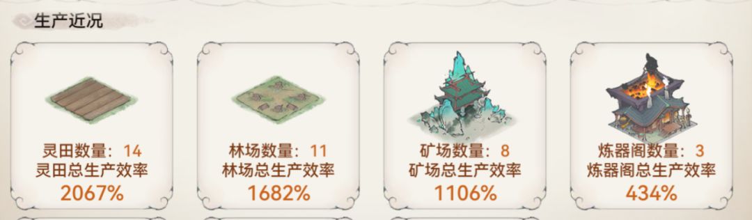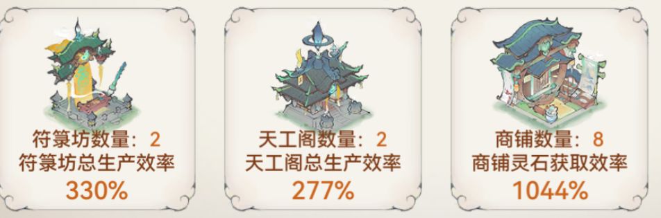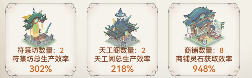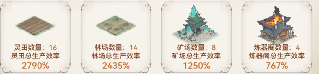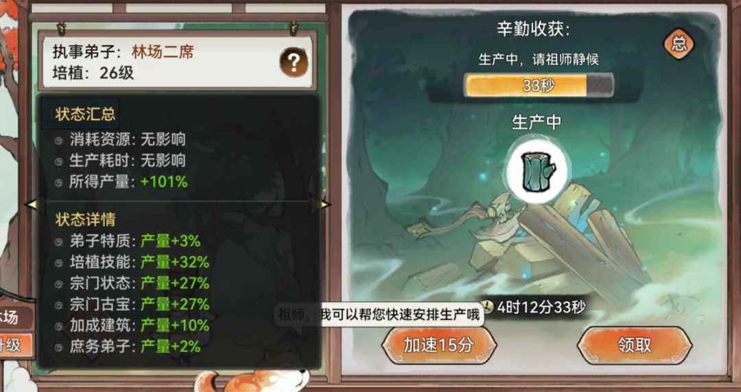 除了后勤弟子本身,生产资源等级与古宝加成,宗门状态,加成建筑有关系,以猪八戒所在林场为例,宗门状态+古宝+建筑也提供了将近1/3的加成,不可忽视