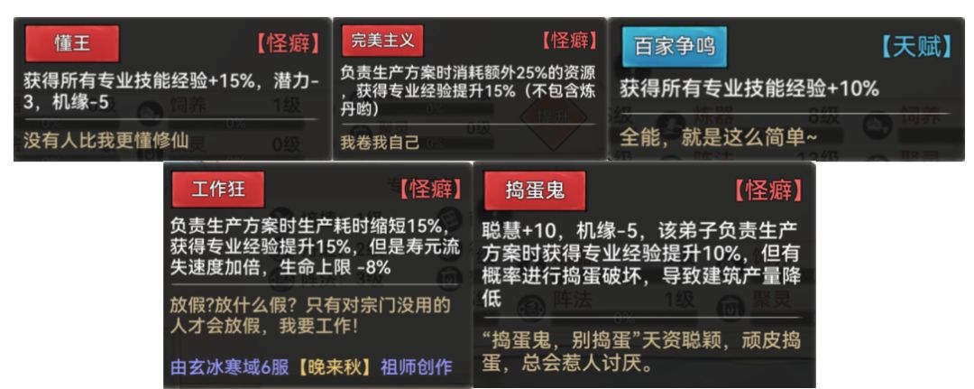 4)以下词条可重点关注,这些怪癖都能用小代价的debuff换取更高专业技能提升。对于完美主义,在中后期资源完全富余的情况下,反而是利大于弊的特质,不需要去除。