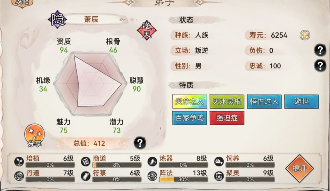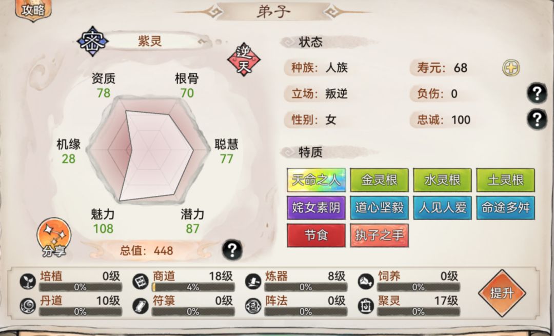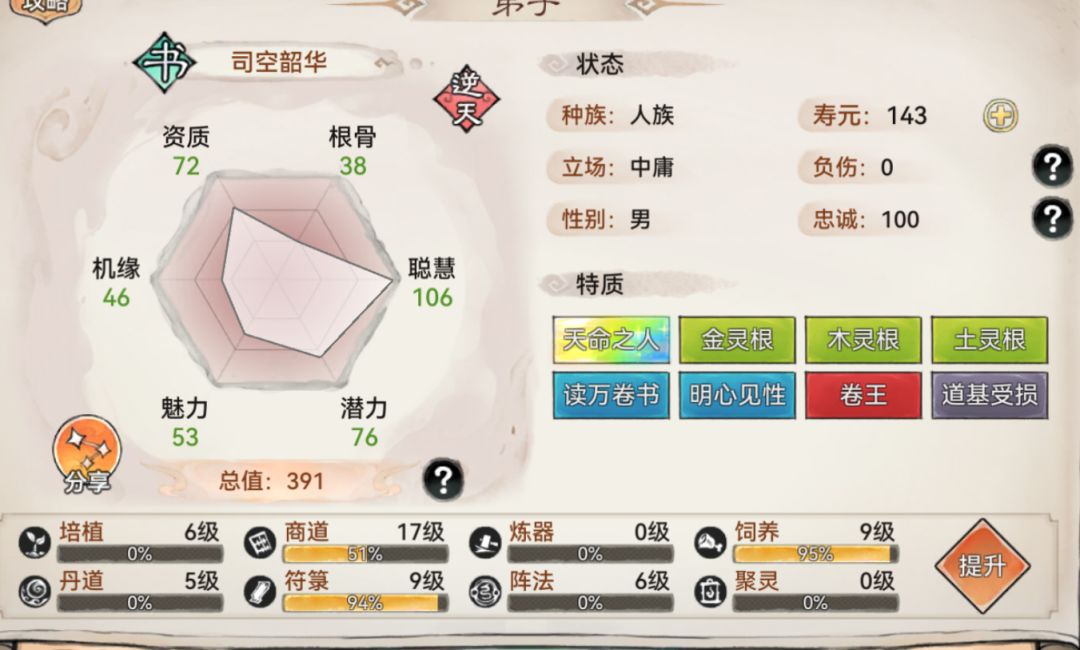 此时可以按照聪慧值高低,在平日招募中逐渐迭代较低聪慧值的弟子,提高后勤弟子的整体生产水平。