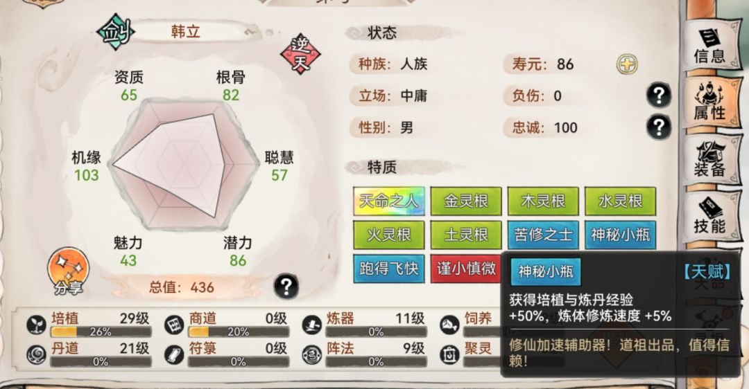 另外凡人联动开启后,韩立以其唯一特质神秘小瓶一骑绝尘,本就合格聪慧值57加上高达+50%的经验加成,还有初始自带的培植与丹道21级专业技能,妥妥的灵田专属弟子。
