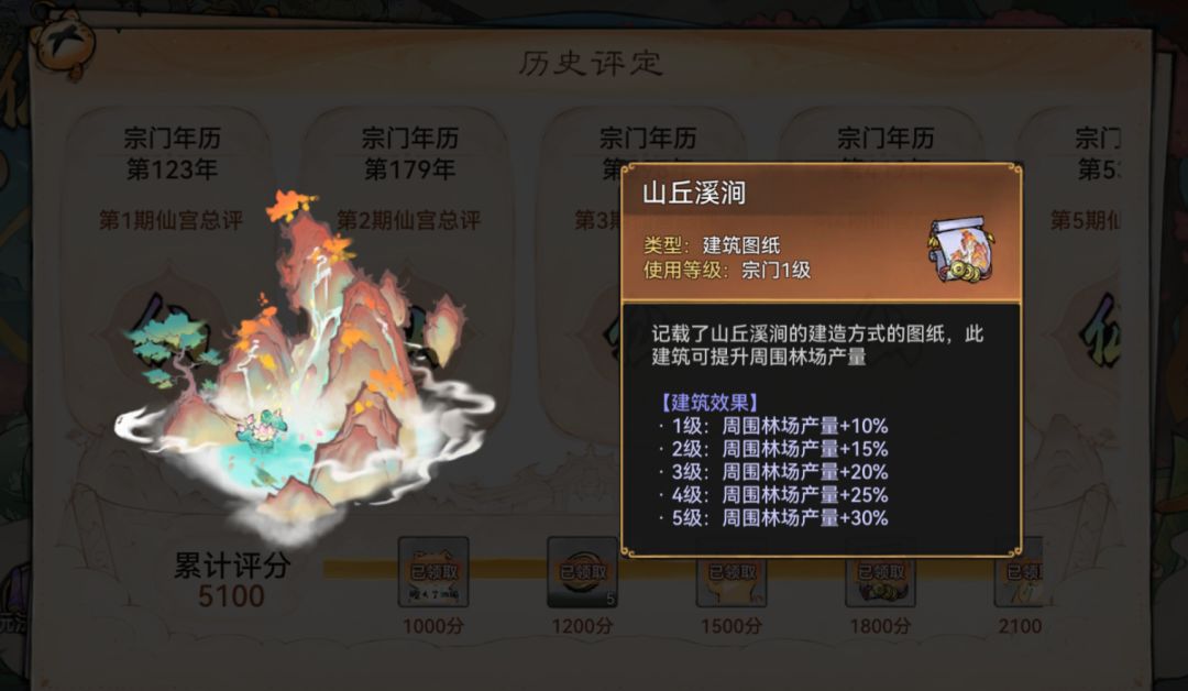 仙宫评定达到一定分数会解锁提升林场、矿场的加成建筑。建筑可以最多覆盖12个生产建筑(隔开放,保证每块建筑能碰到加成范围就好,不需要完全覆盖才有效果,如下图),而且显示建筑是可以升级的,猜测后面活动或者氪金可以获得重复建筑生星