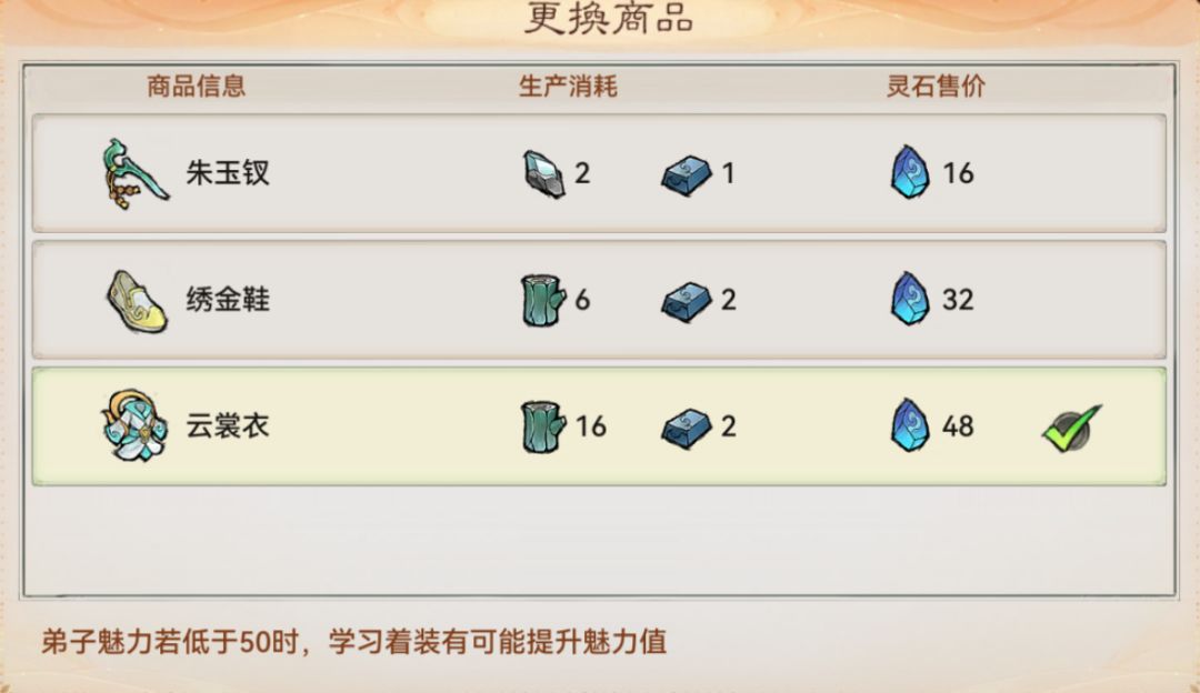 商铺种类尽量多样化,虽然酒铺收益高,但是会让弟子染上酗酒的怪癖,对于不同商铺的效果,点开出售商品界面即可看到。由于有平仓机制,因此不担心生产商品会导致生产资源耗尽。另外平日里可以生产多一些和客栈商人交易的物品,客栈商人是提供灵玉和满意度的重要渠道,可以多加利用。