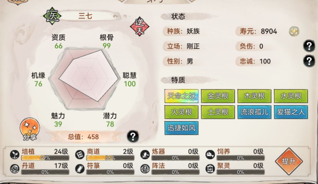 三七虽然没有培植奇才,但初始聪慧值高达95且初始自带培植丹道技能17级,也非常适合用作灵田/林场。