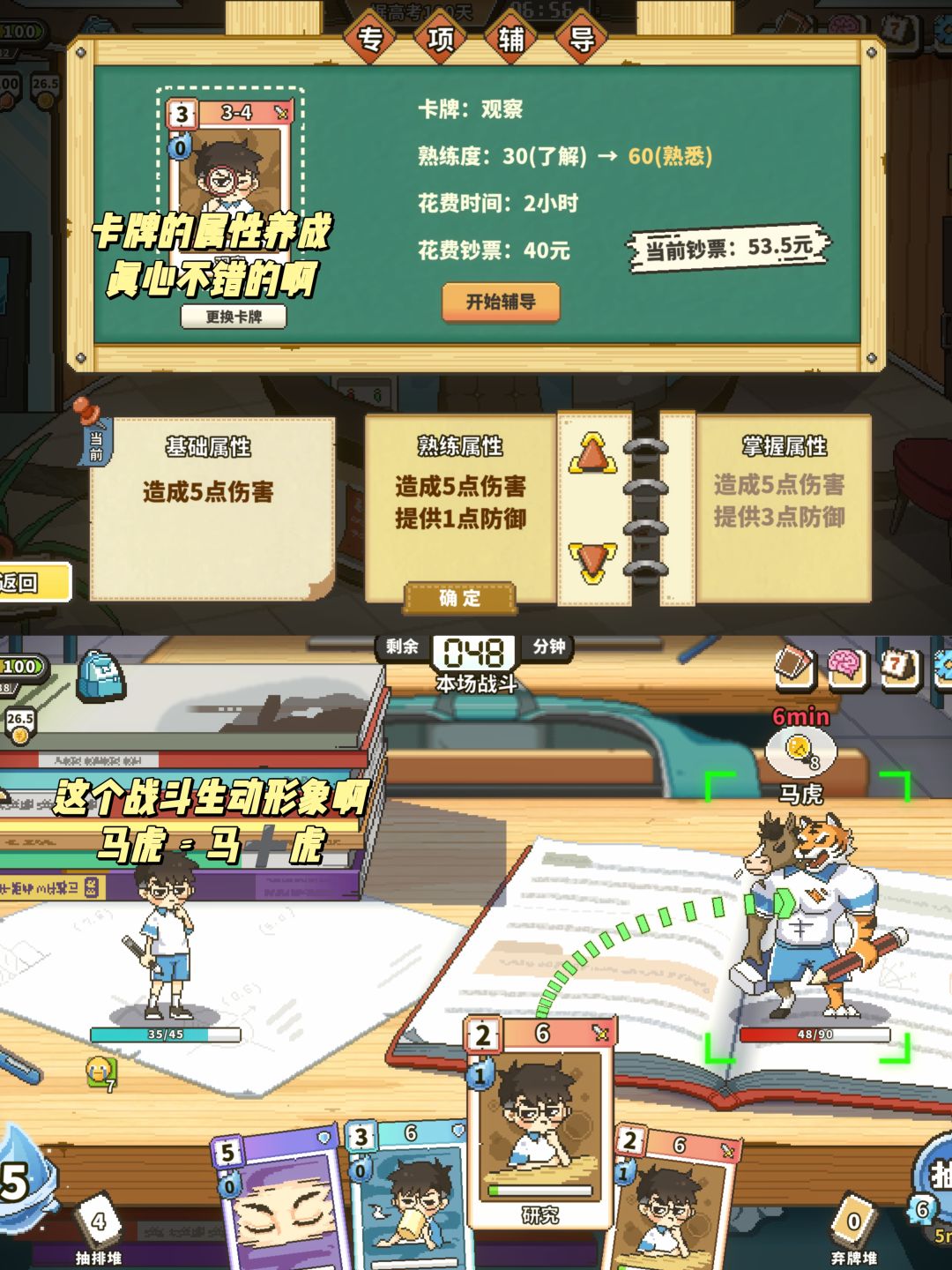主要是以养成玩法为主,其次游戏中也有很多复刻的地点,如食堂,小吃街,网吧等等。中间也穿插有战斗,不过还是靠卡牌来进行的