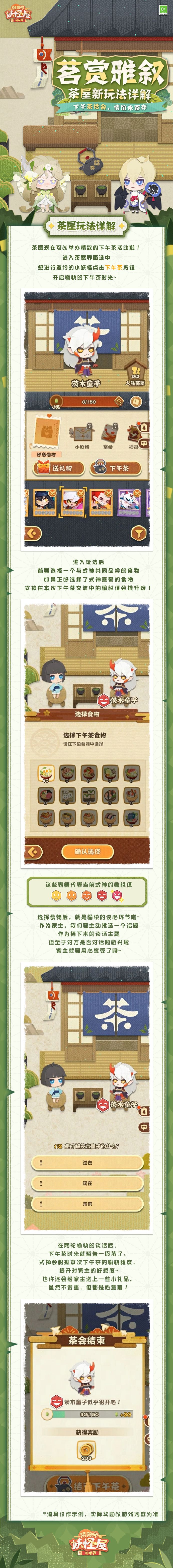 庭院茶屋建筑全新功能上线,茶话会时间开始!家主可以邀约心仪的妖妖前辈,准备他喜欢的食物,选择他感兴趣的话题,开始愉快的下午茶环节环节呀~