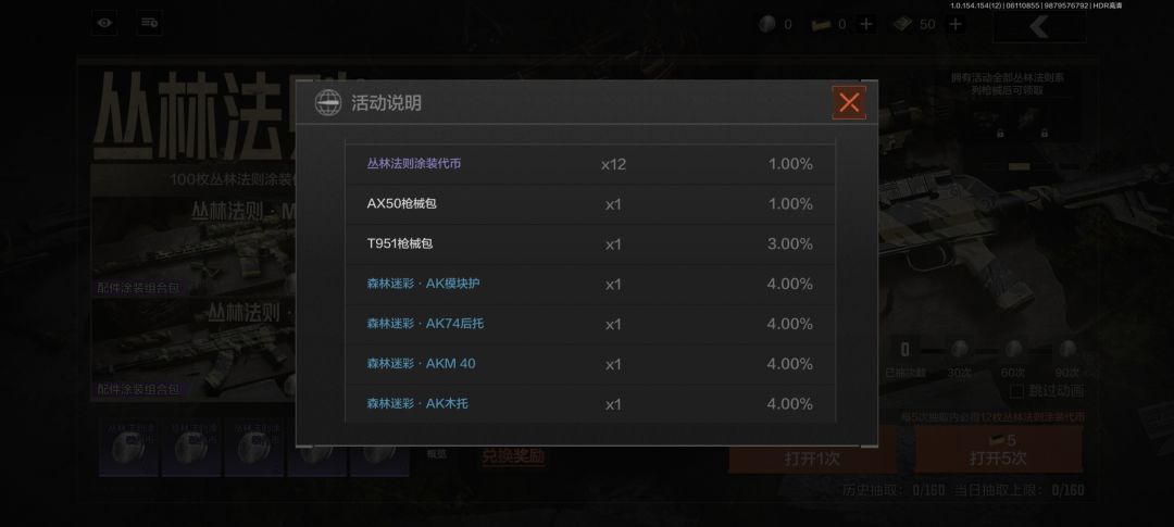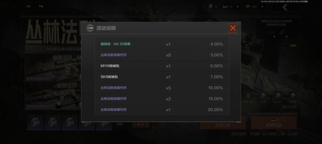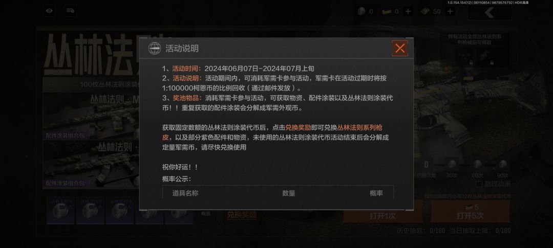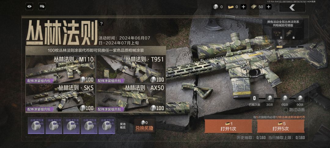 同时还出了个丛林法则的军需,这个就牛逼了,一眼过去四个皮肤,但是一看规则,不是直接抽皮肤的,是要抽那个代币,用代币换,十块钱抽一次。