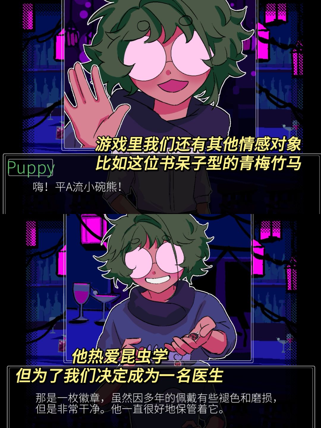 游戏目前在itch上已发布第一章,汉化可以在up“copiklaGrogu”找,不过第一章更多的是跟青梅竹马的甜甜日常(很甜,但是我直觉这个竹马也不太正常),这位危险的相亲对象还没登场,感兴趣的姐妹可以去玩玩看,或者蹲蹲完整版~
