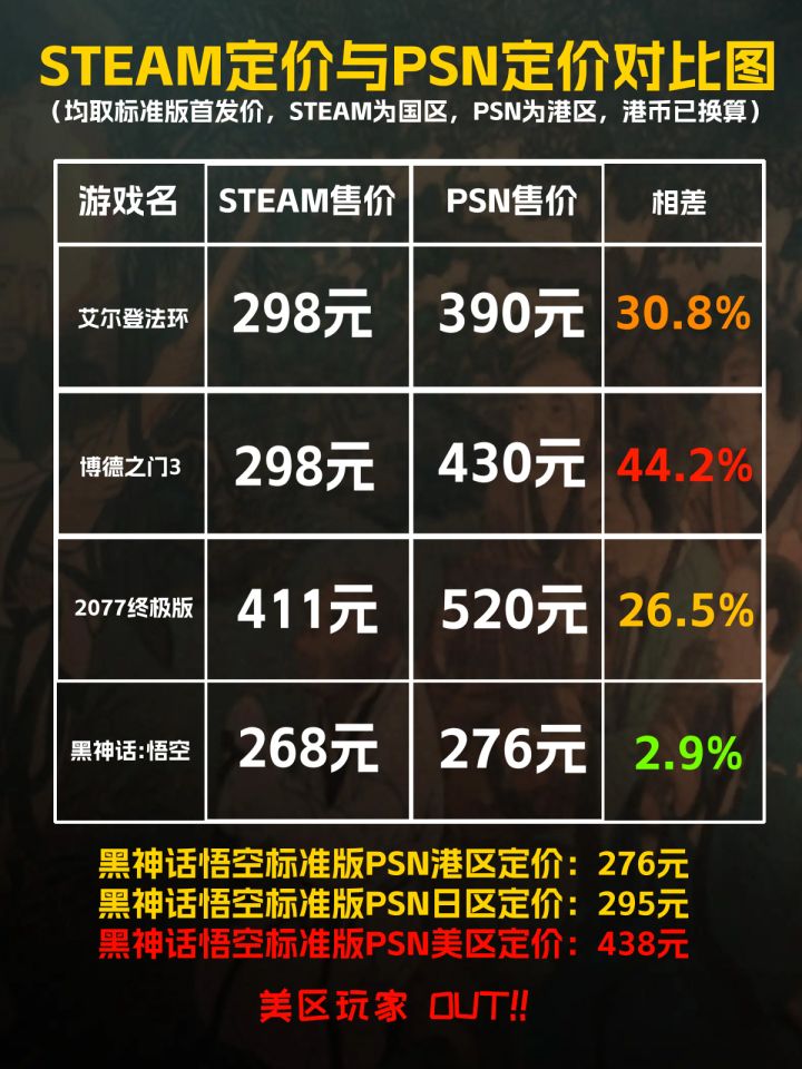 因为种种原因,PS5版的定价是常年比steam要高不少的,线上联机还要开通一年300+的会员,所以主机玩家对黑神话悟空PS5版价格的期望大概在400~500元。而在一众大作价格高出25%甚至44%的时候,黑神话悟空的港区定价把差价控制在2.9%真的很良心很良心了。