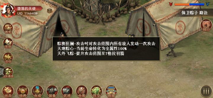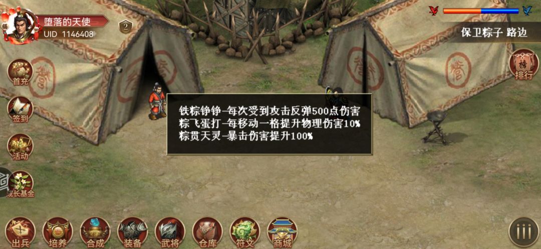 开局刘备加五个出站位,进入关卡保护粽子,杀敌会有人头数,人头数在准备界面可以买粽子(就是后面截图的特技,只生效一次,多次购买无效,内购不能购买,人物就看自己培养,可以开局弄内购让难度降低一点也可以不弄,看个人需求,前期培养高的还好,低了的话有点难打,后面有特技要好打很多,个人推荐天外飞粽-粽挽狂澜-粽德高地-易经棕-其他特技,特技是四个一组按照顺序,可以结束档sl),一共有三轮,第一轮粽子和我军一起出战,粽子到达一定位置会有伏兵出现,最后粽子到右上角或者左下角过第一轮,过了就会出现第二轮的。第二轮粽子和敌军出现(我军任意一人接触变成友军,注意别把粽子打死了),粽子到右上角过第二轮,过了就会出现第三轮的。第三轮粽子出现在右下角,每个房间都会出现敌军(第三轮敌军进入狂暴状态,敌军有特技,敌军特技可以通过重开sl,自曝有吸血可以顶住,敌军有个特技是我军主动攻击回合物理防御非常高,除非属性高,不然物理伤害为零,法术和兵仙可以打出伤害),最后粽子到右上角过关。粽子保护一个五十积分,人头一个一分,死一个粽子扣三百积分并直接过关。