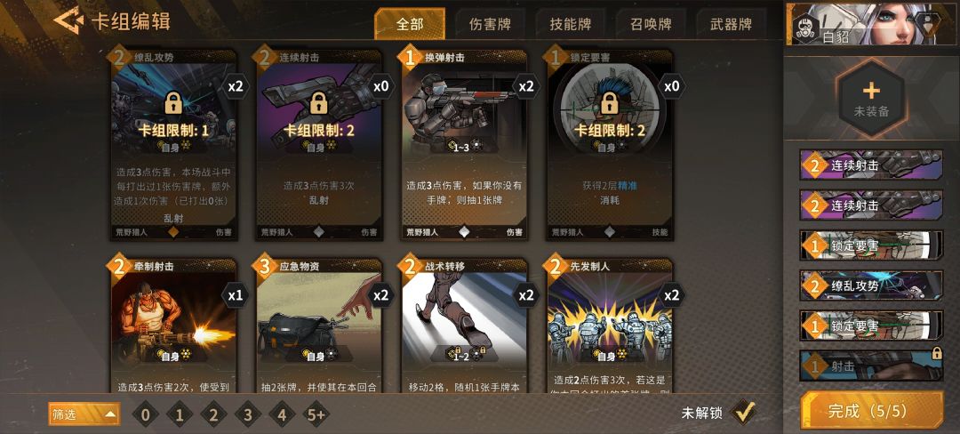 初始卡组:连续射击×2 锁定伤害×2 缭乱攻势×1 (均无强化)